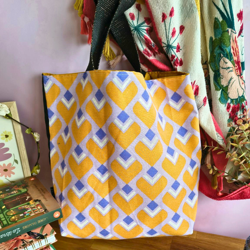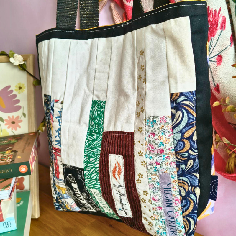 Avec ses tissus assemblés comme une pile de romans, il évoque une bibliothèque douce et vivante. Pratique et plein de charme, il t’accompagne partout — pour transporter tes livres et prolonger ces moments rien qu’à toi.