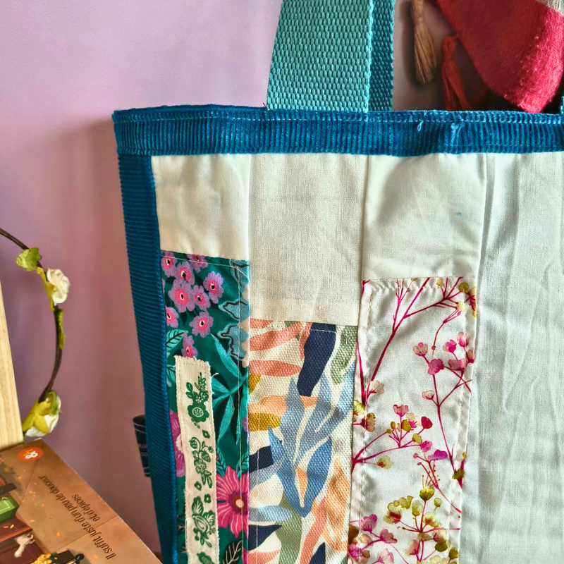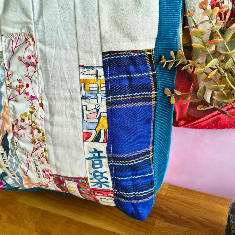 Chaque cabas est confectionné à partir de chutes de tissus soigneusement sélectionnées puis assemblées en patchwork.