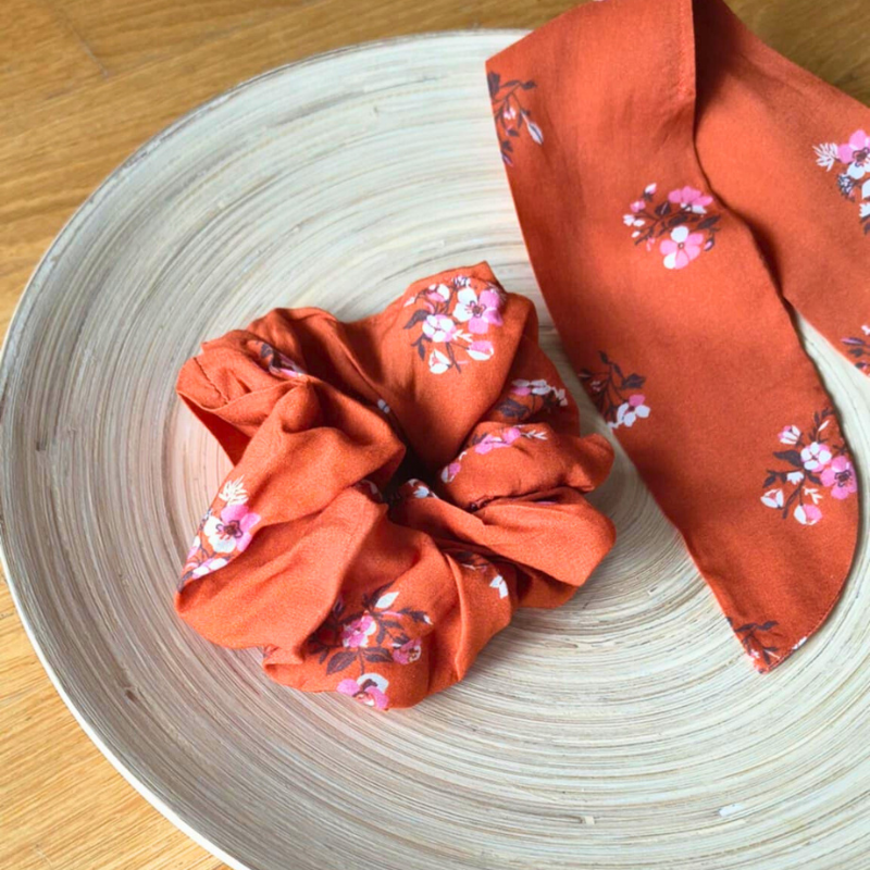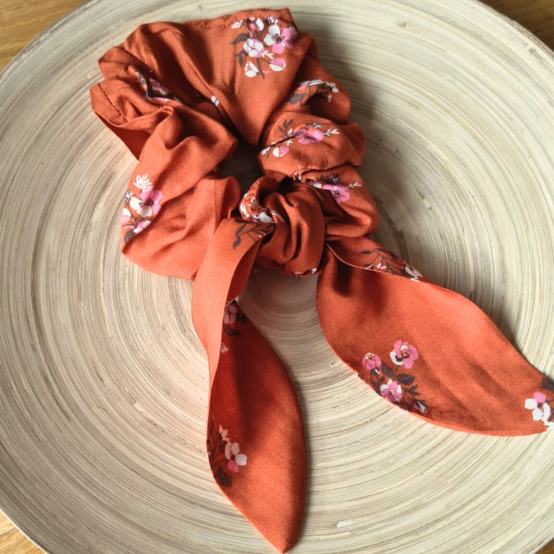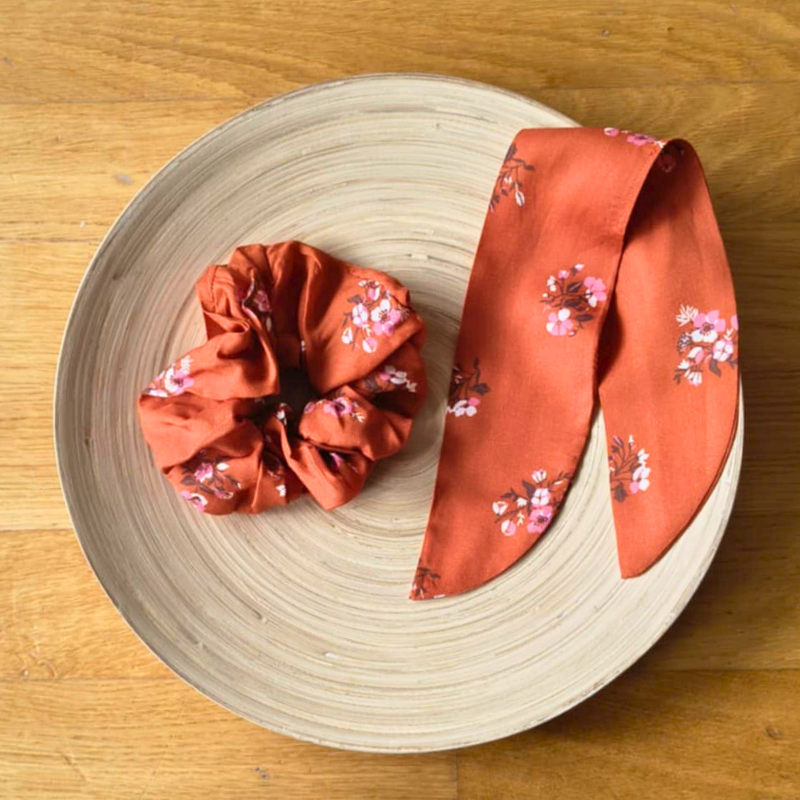 Ce chouchou fleuri est un hymne aux petites douceurs : une tasse de thé chaud, un plaid douillet, un livre qu’on ne lâche pas. Pensé dans une démarche zéro déchet, il est réalisé à partir de chutes de tissu de robe. Son élastique large et plat respecte tes cheveux tout en offrant un maintien parfait, même au poignet. Le nœud amovible évoque un ruban de signet, clin d’œil à ton univers de lectrice.