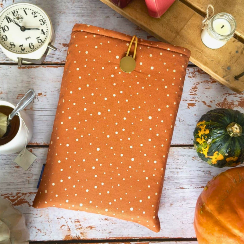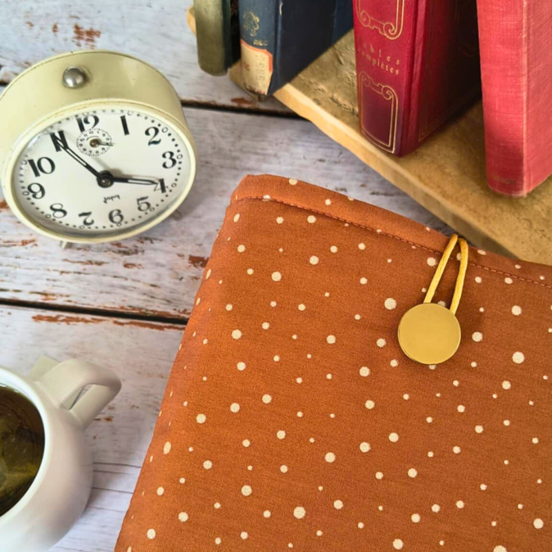 La pochette de livre Octobre est une invitation à savourer l’automne en toute sérénité. Avec son tissu terracotta ponctué de pois doré, elle capture la douceur des balades sous les feuilles rousses et l’atmosphère cosy des soirées lecture.